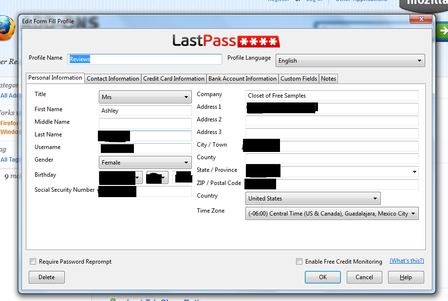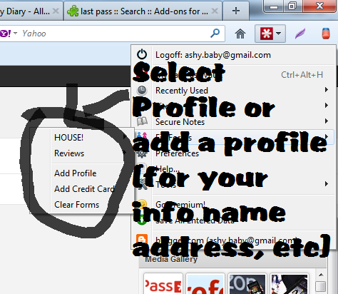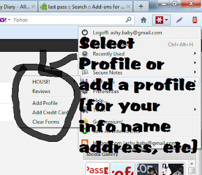 Once you have downloaded firefox make sure you check out the firefox add ons section. This is where you can customize firefox with tools that you use. Once you get to the addons page you want to download the add on called "Last Pass" LastPass is a free online password manager and Form Filler that makes your web browsing easier and more secure. Plus it has my favorite feature of being able to fill in your information (name, address, email, phone number, etc) so that way you no longer have to fill out all that information everywhere. You just simply click the "profile" you want to use and your info is filled! See the images below.
